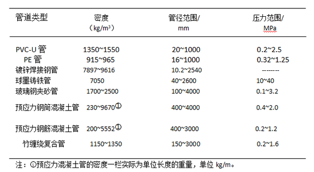密度和壁厚決定了管道單位長度的重量,直接影響工程的投資和施工的便捷程度。 密度從高到低依次為:預(yù)應(yīng)力鋼筒混凝土管、鍍鋅焊接鋼管、球墨鑄鐵管、玻璃鋼夾砂管、PVC-U、竹復(fù)合壓力管和PE管。預(yù)應(yīng)力鋼筒混凝土管、預(yù)應(yīng)力鋼筋混凝土管、大口徑鍍鋅管焊接鋼管和球墨鑄鐵管需要借助專業(yè)機(jī)械吊裝。