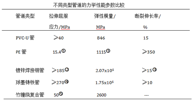 從拉伸強(qiáng)度和彈性模量上講,PVC-U管和PE管的彈性模量基本相當(dāng),竹纏繞復(fù)合管是塑料管道的2~3倍45 ,PE管的拉伸屈服應(yīng)力比二者都小。鍍鋅焊接鋼管和球墨鑄鐵管強(qiáng)度最高,其拉伸屈服強(qiáng)度在185 MPa以上,鋼管的彈性模量和球墨鑄鐵管相當(dāng),在17 GPa以上,是塑料管道和竹纏繞復(fù)合管的67~244倍。