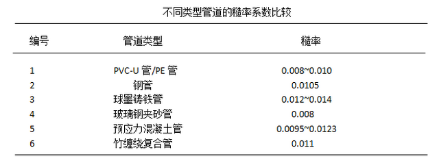 我們采用糙率系數(shù)n對不同管道的水力學(xué)性能進(jìn)行對比分析。在過流量、管道坡度一定的情況下,糙率系數(shù)n越大,相應(yīng)的管道直徑也越大。不同類型管道的糙率系數(shù)見下表。